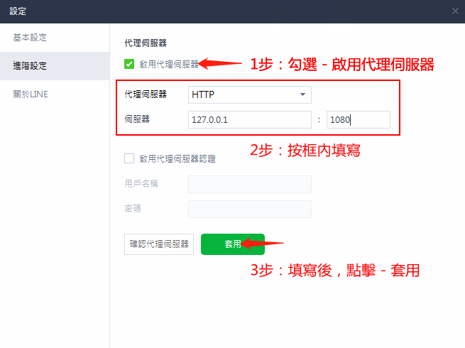 第4步:勾選 - 啟用代理服務器,代理服務器 - 選擇HTTP,服務器輸入:127.0.0.1,端口:1080,點擊 - 應用,設置完畢!