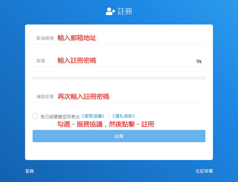在註冊頁面輸入郵箱,和易記的密碼,勾選服務協議,點擊-註冊即可!