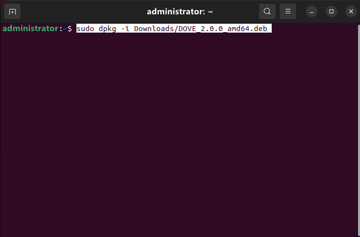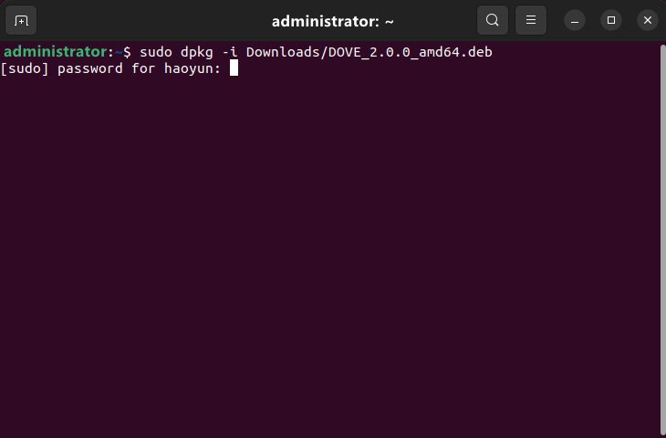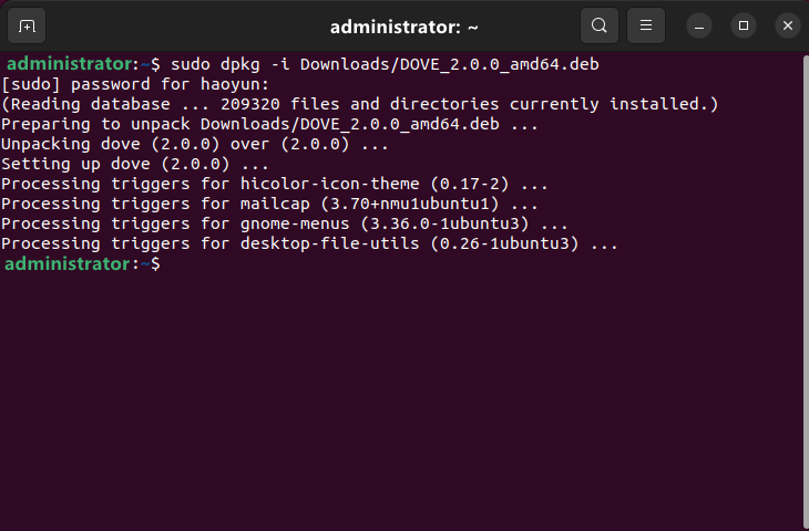 第2步:复制粘贴输入命令:sudo dpkg -i Downloads/DOVE_2.0.5_amd64.deb