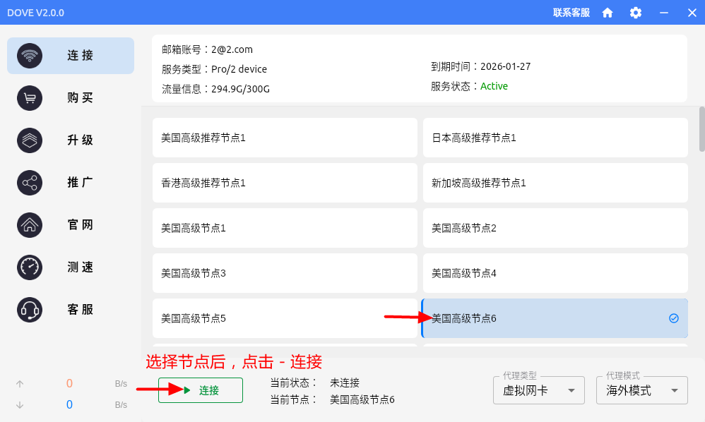 第7步:点击选择 - 服务器节点,代理类型和代理模式都选择默认,然后点击 - 连接,显示 - DOVE已连接,就可以使用了(如图)
